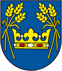 - V modrom štíte zlatá, perlami a rubínmi zdobená koruna, sprevádzaná po bokoch trojicami zlatých bezostých skrížených klasov.